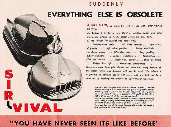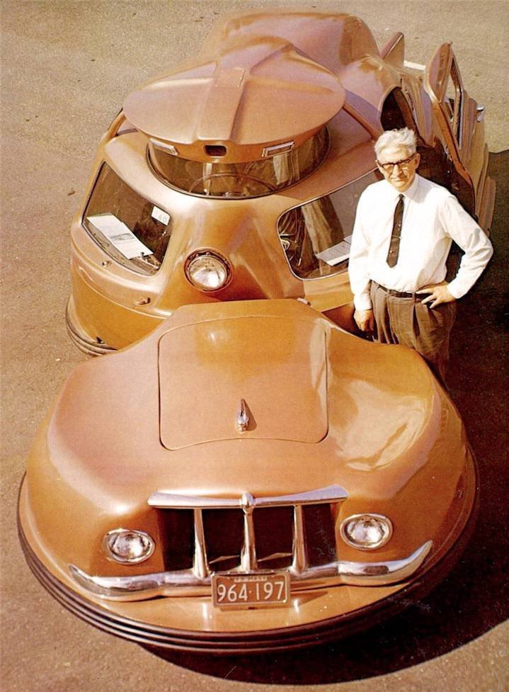 Перед вами автомобиль с красивым названием Sir Vival – реализованный в металле концепт «самой безопасной машины в мире», публике это чудо показали в 1958 году. Водитель этого авто находился в специальной капсуле с 360-градусным обзором, а кузов машины состоял из двух секций, которые имели шарнирное соединение и в первой из них находился двигатель. Подразумевалось, что при ударе передняя секция должна была гасить удар, в то время как водитель и пассажиры во второй не должны были бы пострадать