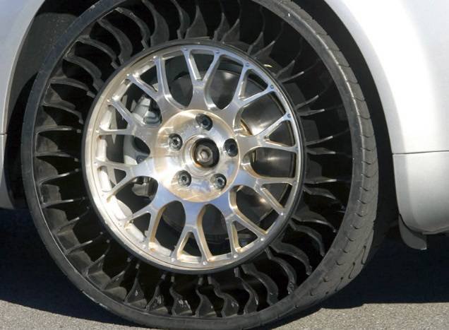 Эти необычные шины изначально были разработаны для военной техники, т. к. имели ряд преимуществ перед обычными шинами накаченными воздухом — они не боятся проколов. Но теперь ведутся разработки и испытания шин и для обычных, городских автомобилей. Конечно такие колеса имеют ряд недостатков, например они очень шумные, а так же остается нерешенным вопрос о попадании посторонних предметов и грязи в полость шины, которые провоцируют дисбаланс колеса. Но в любом случае разработка весьма интересна, и несомненно имеет право на жизнь…