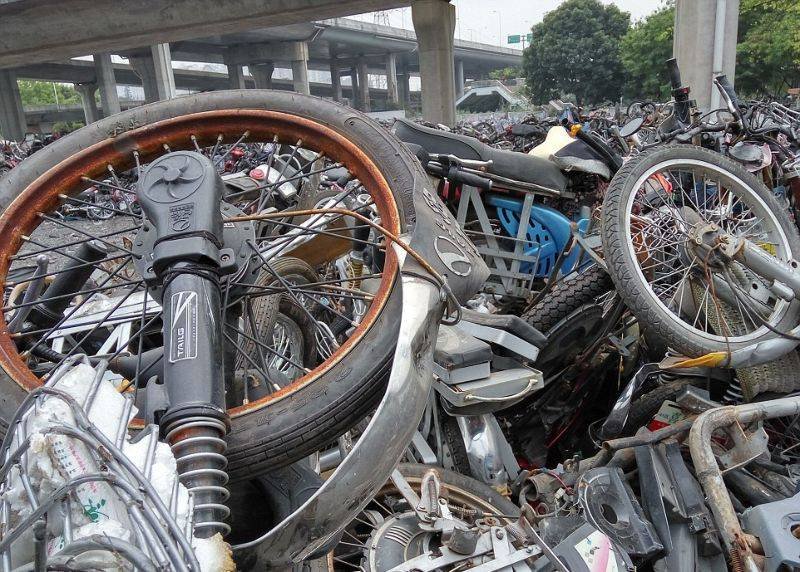 Все это свалили под мост, в результате чего образовалось настоящее кладбище мототехники.