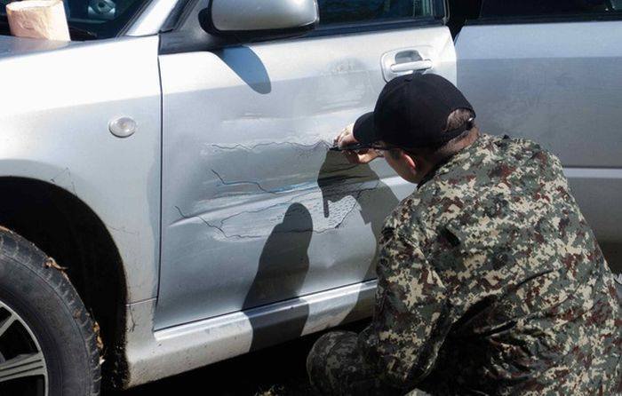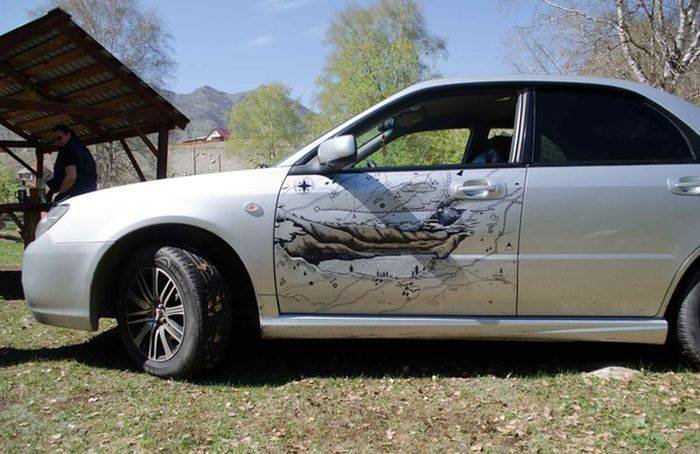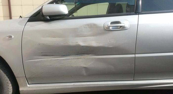 Перед вами последствия одного ДТП, оставшиеся на двери автомобиля, хозяин которого сделал эти фото. Виновник аварии купил новую дверь, однако возможности установить ее сразу не было, поэтому решено было временно скрыть все это уродство. Как удалось это сделать, смотрите далее.