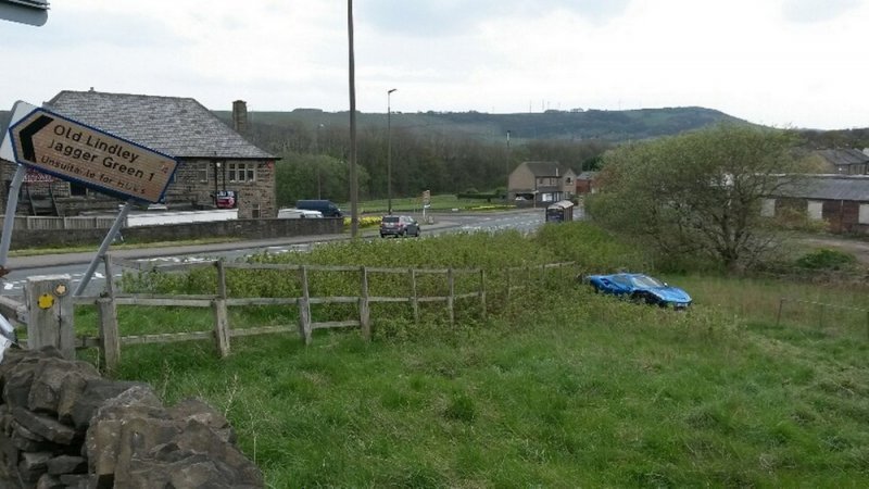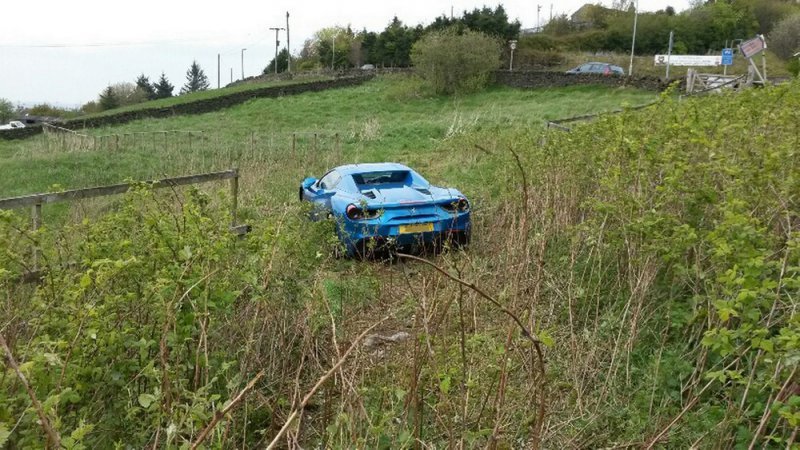 Синий Ferrari 488 GTB, стоимостью свыше $260 000, был обнаружен автолюбителями в поле в деревне Outlane возле Хаддерсфилд, Западный Йоркшир. Автомобиль был поврежден, видимо водитель не справился с управлением и вылетел с дороги, снеся забор. Неизвестно, кто владелец авто, в пресс-службе полиции Западного Йоркшира сказали, что им не поступало сообщений о данном происшествии.