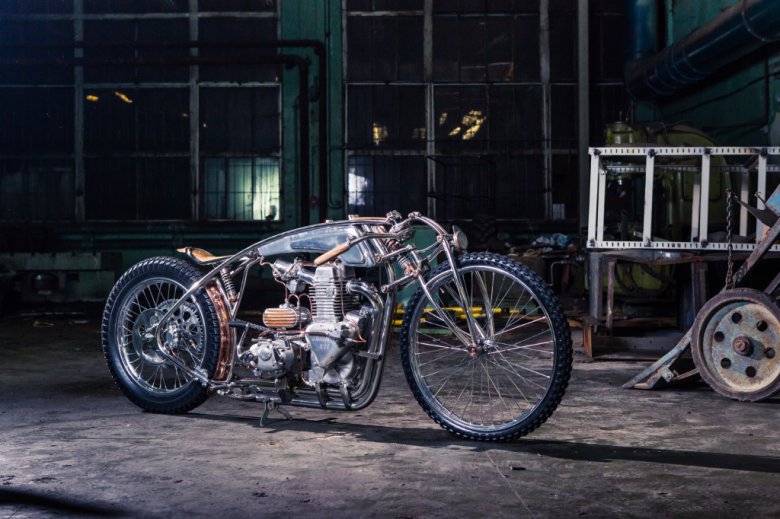 Лаченный дуб, медные крылья и медные трубки – вот в чём есть нужный посыл и выразительность на грани высокой художественности! Для изготовления рукояток руля и сиденья Дмитрий использовал обрезки досок и один черенок от лопаты с рынка. Красота в простоте и терпении! Интересная история связана с появлением позади чешского спидвейного мотора пятиступенчатой коробки передач от английского мотоцикла BSA 1965 года.