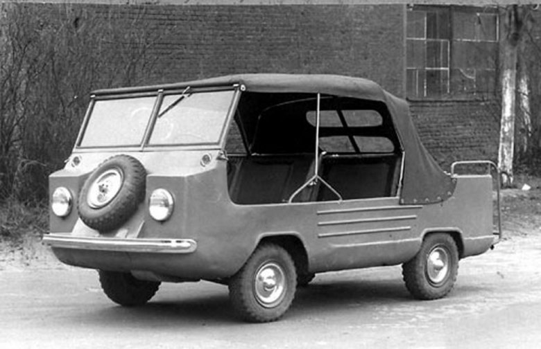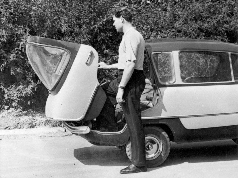 Внешне автомобиль был поистине уникальным: подрезанный спереди кузов, расположенный сзади мотор, дверь для посадки на задние сиденья только с правой стороны. Но самое главное — откидывающаяся вверх-вперед передняя часть кузова, через которую производилась посадка на места водителя и переднее пассажирское.