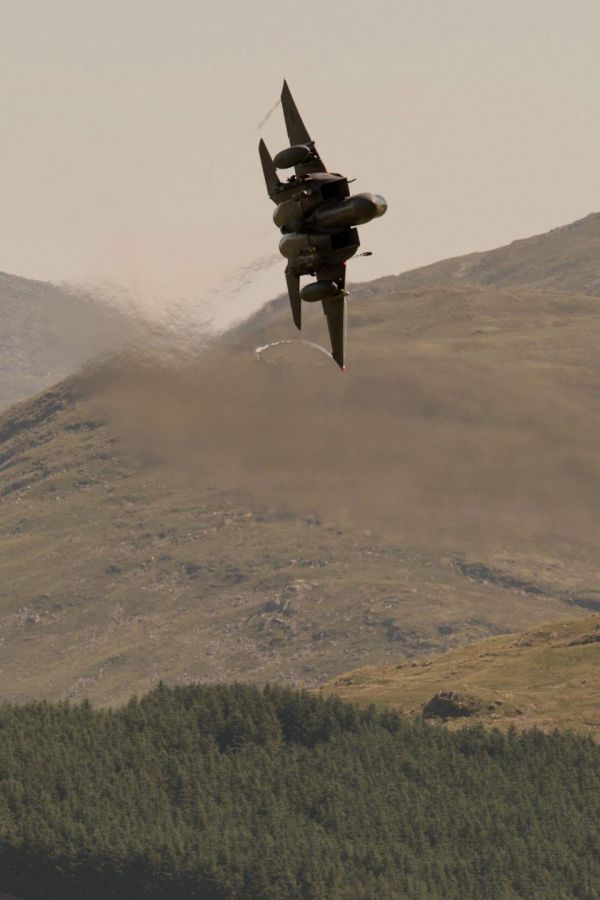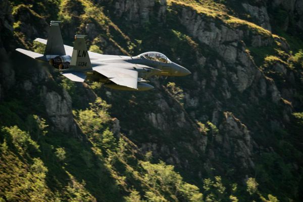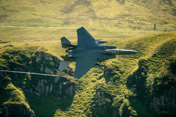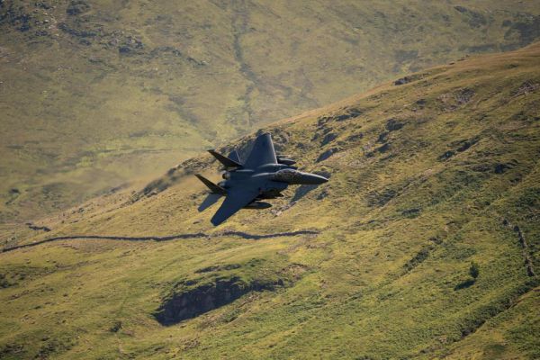 На видео и фото ниже вы сможете посмотреть весь профессионализм лётчиков-асов американских ВВС, управляющих военным самолётом F-15 Strike Eagle, который им порой удаётся приближать вплотную к холмистым пейзажам Уэльса на расстояние до 75 метров.
