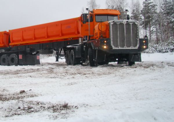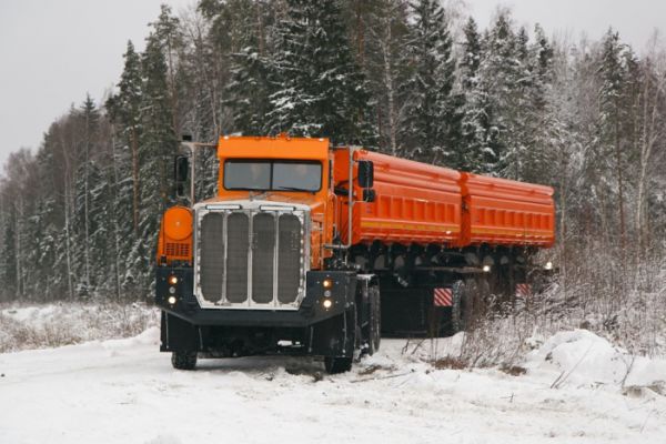 Посмотрите на этот тягач повнимательнее. Думаете, это сделано в США? На самом деле это вовсе не какой-нибудь «Freightliner» или даже «Kenworth», а российский «Тонар», созданный для работы в экстремальных климатических условиях. На сегодняшний день это самый дорогой тягач, который дала миру отечественная промышленность.