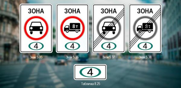 Цифра в зеленом кружке на знаке ограничивает движение автомобилей в транспортном потоке не по его классу, а по его экологической характеристике. Так, например цифра «4» означает соответствие машины уровню «Евро-4», запрещая таким образом проезд в этом месте любых других машин, которые обладают более низким экологическим стандартом, например «Евро-3».