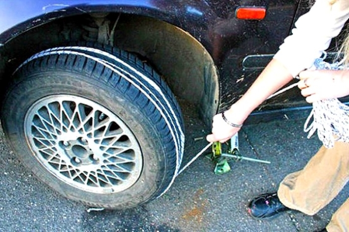 Теперь, включаем передачу (лучше всего третью) и зажигание. Свободное колесо разворачиваем так, как удобно. Затем, наматываем на него трос в 3-5 оборотов. Использовать можно как непосредственно буксирный трос, так и любую другую более-менее прочную и надежную веревку. Намотку выполняем как можно более туго.