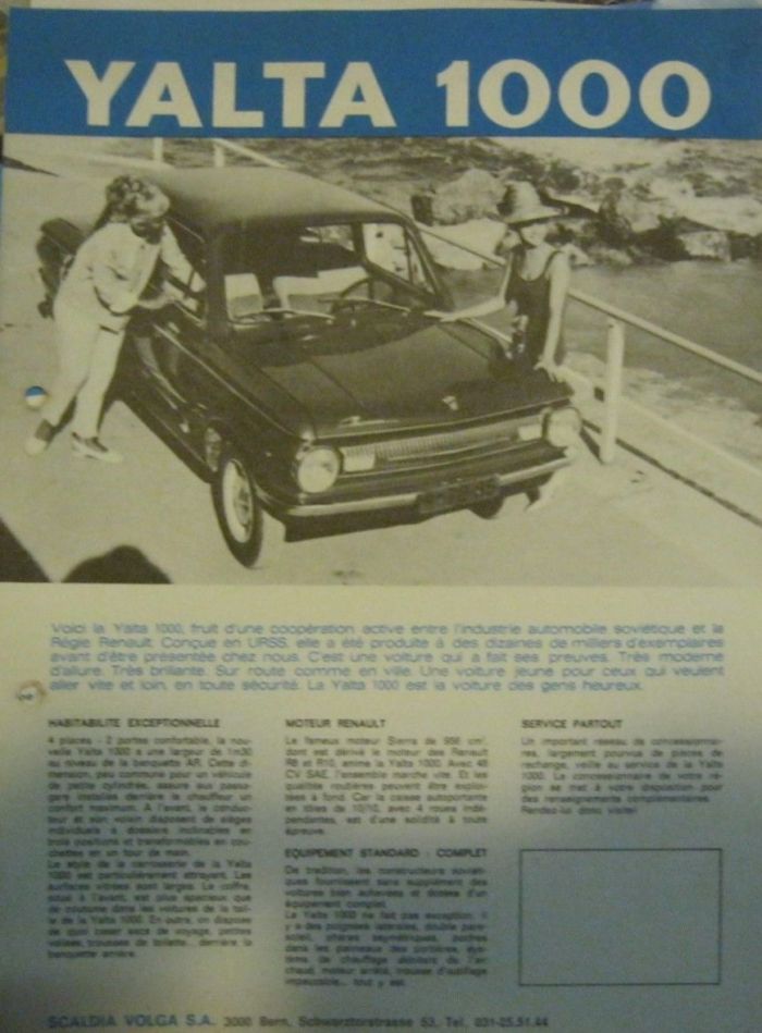 Планировалось наладить выпуск Yalta 1000 на мощностях бельгийской компании S.A. Scaldia-Volga — известного импортера советских автомобилей в стране Бенилюкса. В статье в журнале «The Engineer» за 1968 год сообщается, что у импортера были какие-то договоренности с компанией Renault в Бельгии на поставку двигателей R8, а производство Yalta 1000 планировалось на новом заводе в той же Бельгии.