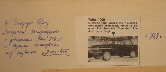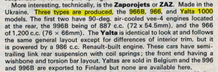 Он был создан в единственном экземпляре и получил название Yalta 1000. Как было написано в статье Autocar от 4 июля 1968 года: «Yalta выглядит аналогично [прим. ред., обычному ЗАЗ-966], в её основе та же самая конструкция, за исключением разницы в отделке, но оснащается автомобиль двигателем Renault объёмом 986 куб.см».
