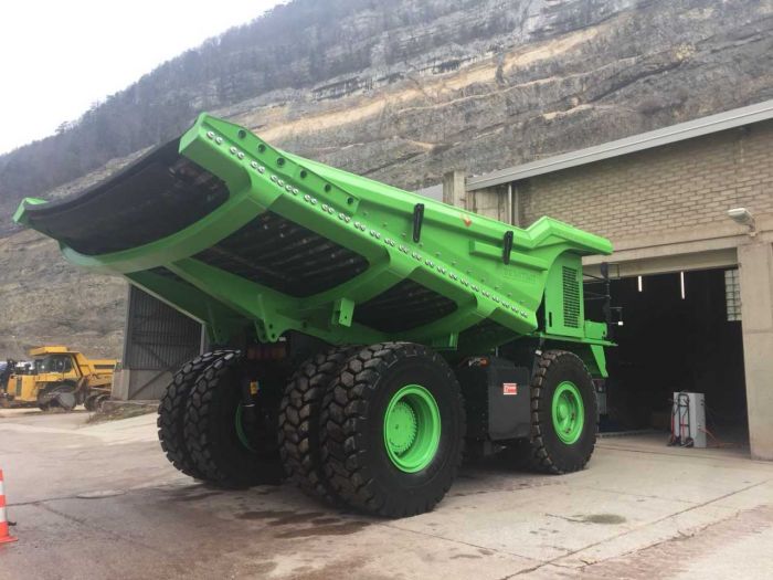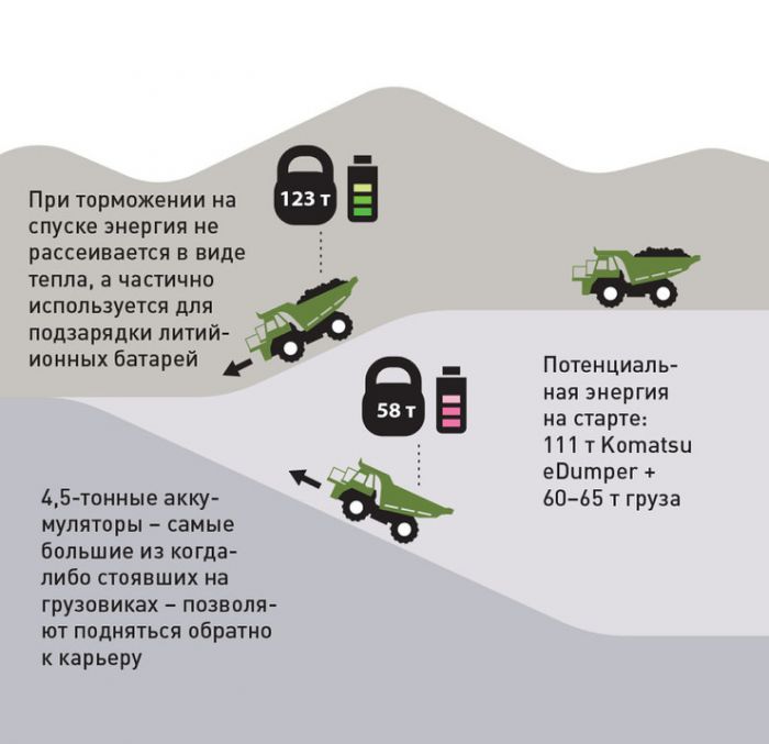 Базой для электрического E-Dumper стал гигантский карьерный самосвал Komatsu HD605-7, из которого был извлечен его родной 23-литровый дизельный двигатель. Вместо него были установлены мощные электродвигатели и аккумуляторная батарея емкостью 600 кВт*ч. И получившийся электрический «монстр» отправился работать на карьер Pery, расположенный в 100 километрах от Цюриха.Организация карьера дала самосвалу E-Dumper уникальную возможность самому вырабатывать необходимую ему энергию. Пустой самосвал поднимается на гору, где его загружают 60 тоннами камней. Съезжая по 13-градусному спуску с тяжелым грузом, грузовик E-Dumper использует свои двигатели в качестве электрических генераторов, заряжающих его огромную батарею. И выработанной за один спуск энергии достаточно для того, чтобы пустой самосвал E-Dumper снова поднялся на гору под очередную погрузку.