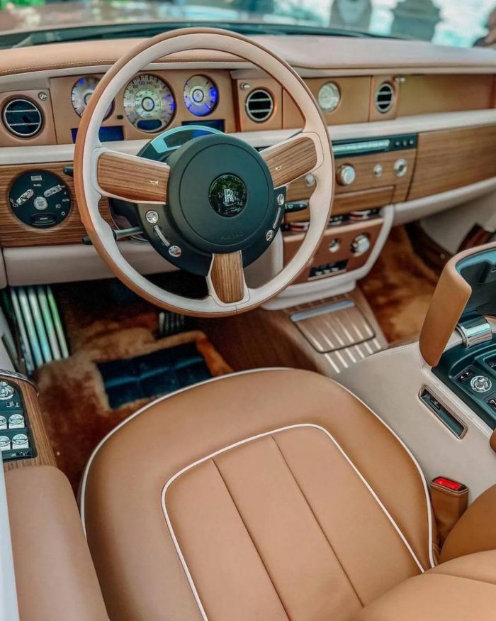 Что он получил за такие деньги? Автомобиль выполнен в цвете «сигары с оттенком виски» c перламутровым отливом. Отделка интерьера — из бронзы, золота, алюминия и хрусталя. Крышки багажника (да, их две) покрыты снаружи шпоном королевского орехового дерева.