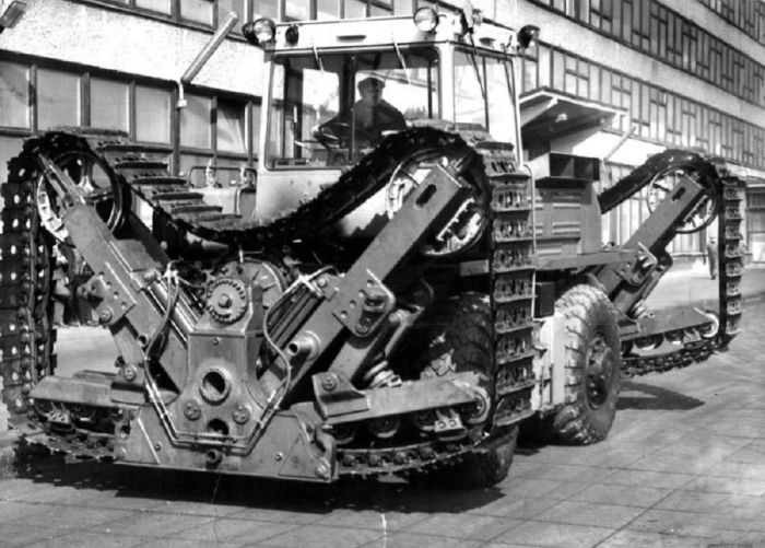 Пожалуй самый необычный советский трактор появился в 1970 году. Монструозная машина ТЭТ-1000 созданная специалистами Харьковского тракторного завода, предназначалась для вспашки средних и тяжелых почв на глубину до 38 см. Трактор имел универсальный колесно-гусеничный ход и по задумке создателей должен был самостоятельно добираться до места работы на колесном ходу, а непосредственно на поле переходить на гусеничный.