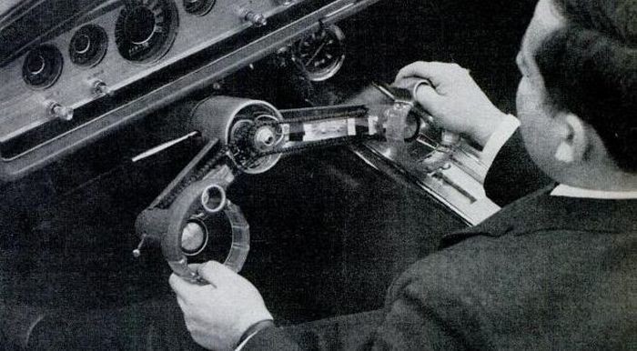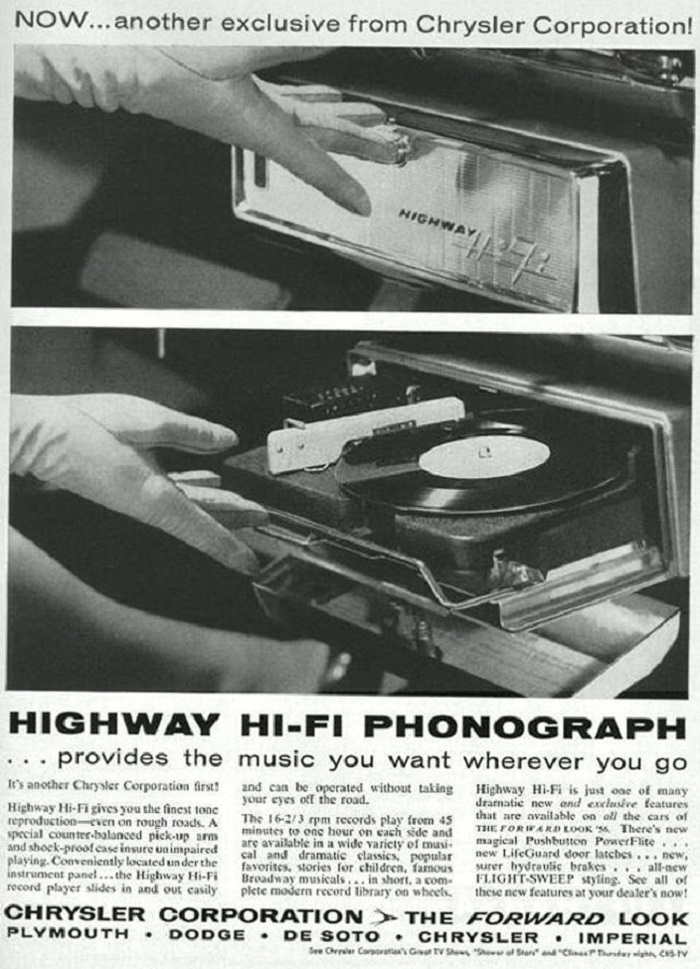В 1956 автомобили Chrysler, DeSoto, Dodge и Plymouth оснащались системой Highway Hi-Fi — виниловым фонографом для автомобилистов-аудифилов. Сейчас проигрыватель в машине кажется чем-то само собой разумеющимся, но тогда все уперлось в технические сложности. От обычных пластинок пришлось отказаться, специально для этого фонографа выпускали особые утяжеленные. Ассортимент был довольно узким, а качество — не самым лучшим. Все же винил лучше слушать дома, а не прыгая по калдобинам.