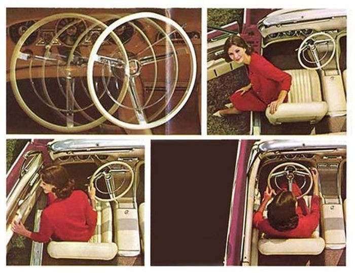За дополнительные 25 долларов в Ford T-bird 1961 года можно было установить модифицированный руль, который откидывался в бок на 26 см. Зачем? Видимо, чтобы полным водителям было легче выбраться из машины. Но в те времена полных людей было в разы меньше, и штука не прижилась. Возможно, ее еще ждет триумфальное возвращение. В отличие от предыдущих изобретений.