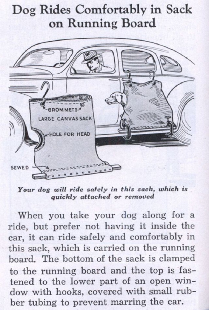 Идея, обрисованная в журнале Popular Mechanics в 1935 году. По задумке такая сумка должна была помочь хозяевам собак держать салон автомобиля в чистоте, в то время как их вуферс «наслаждается» прогулкой снаружи. К счастью, никому не пришло в голову реализовать этот концепт. Более беспощадного способа покалечить пса не придумаешь. А еще, обратите внимание, выходя из машины, водитель будет бить его по голове.