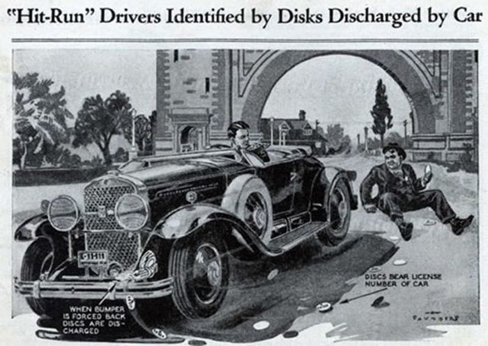 Название сложное, но концепция предельно простая. Все в том же журнале Popular Mechanics в 1931 году появилась идея идентификации водителя, который уехал с места происшествия. По задумке в каждом автомобиле должен был находиться мешок, набитый карточками с информацией о шофере: его имя и номер машины. От удара мешок должен был вскрыться, рассыпав «визитки». Стоит сбить пешехода — и скрыться, не оставив улик, уже не получится.