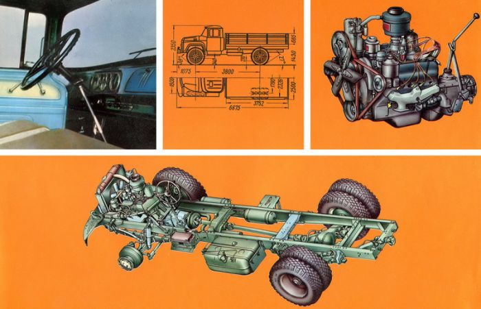 Машина получила совершенно новый мотор. Рядный нижнеклапанный 6‑цилиндровый двигатель рабочим объемом 5,56 л и мощностью 100 л. с., который ставили на ЗИЛ-164А, явно не подходил новому автомобилю, грузоподъемность которого по сравнению с предшественником выросла с 4000 до 5000 кг. Хотя поначалу, все-таки, рассматривали идею установки на новый грузовик форсированного шестицилиндрового мотора. Кстати, этот агрегат, в основе которого лежал еще двигатель американского грузовика Autocar конца 1920‑х, выпускали в Союзе еще много лет. В частности, ставили и на часть самосвалов на базе ЗИЛ-130. Но потенциал модернизации «шестерки», по сути, был исчерпан.