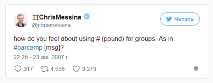 Создателем хештега является бывший дизайнер Google Крис Мессина, который буквально произвел революцию в общении в твиттере с помощью лишь одного символа на клавиатуре.