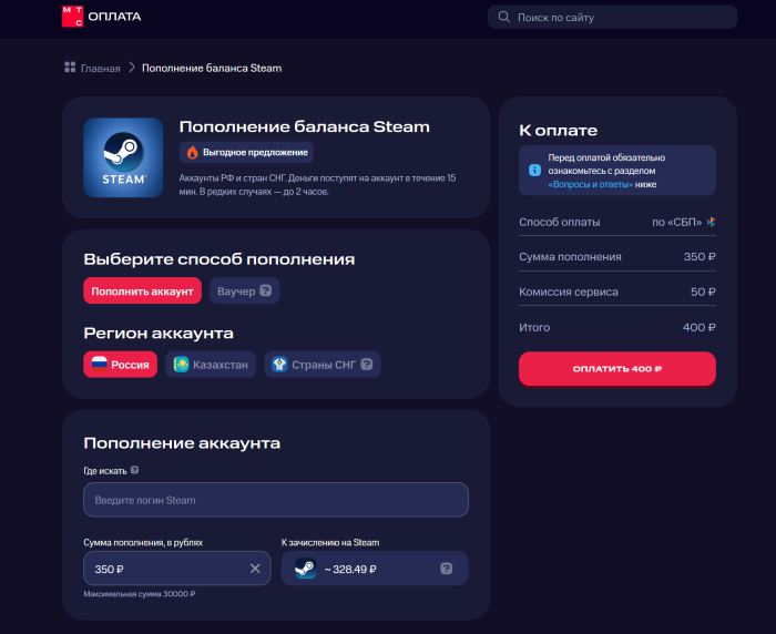 Если тебе нужно пополнить кошелёк Steam быстро и без всяких сложных шагов, то МТС-оплата — это то, что нужно. Проще способа не найти, серьёзно. Вводишь свой логин в Steam, указываешь нужную сумму и оплачиваешь через СБП (Систему Быстрых Платежей). Всё. Никаких дополнительных карт или долгих верификаций.