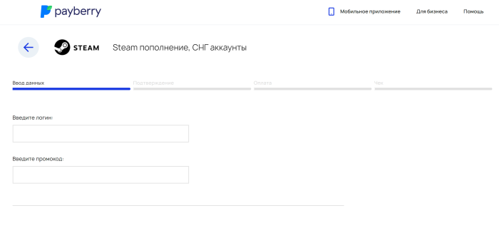 Payberry — полезная штука, если тебе нужно оплатить что угодно, начиная от интернета и заканчивая мобильной связью. Но нас интересует конкретно Steam, и в этом плане у Payberry есть два варианта: либо ты пополняешь напрямую для России и стран СНГ, либо покупаешь карты пополнения для других регионов. Мы разберём первый вариант, как самый простой и понятный