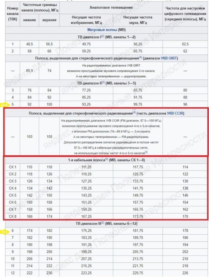 Почему остановились именно на стандарте в 12 телевизионных каналов, ответа найти не удалось. Видимо из привычного часового циферблата. Еще один интересный момент: 5ый и 6ой телевизионные каналы далеко не соседние. Между ними находится полоса УКВ радиовещания и еще 8 телевизионных каналов для использования в кабельном телевидении.