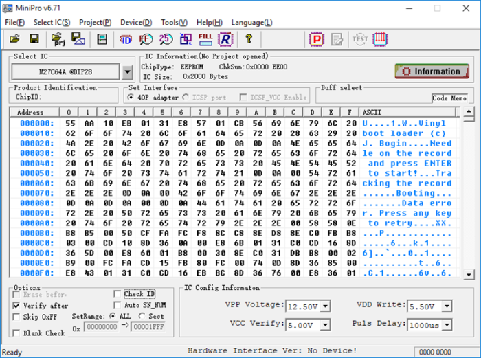 Вот как это описывает ru_vds: Для проведения этого необычного эксперимента персональный компьютер (а точнее — IBM PC) подключён к проигрывателю виниловых пластинок через усилитель. Тут имеется маленький ROM-загрузчик, управляющий встроенным «кассетным интерфейсом» PC (который, пожалуй, никогда и никем не используется). Этот загрузчик вызывается BIOS в том случае, если все остальные способы загрузки не сработали (то есть — загрузка с дискеты и с жёсткого диска). Проигрыватель воспроизводит аналоговую запись содержимого небольшого RAM-диска, предназначенную только для чтения, размер которой составляет 64 Кб.