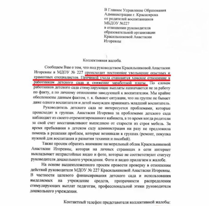 Со слов мам и пап, за прошедшие три года некогда лучший садик в районе Зелёная Роща скатывается в непонятно что. С приходом Анастасии старый персонал начал быстренько увольняться, финансирования не появилось, а на все расходы — от канцелярии до ремонта игровых площадок — вынуждены скидываться сами родители.