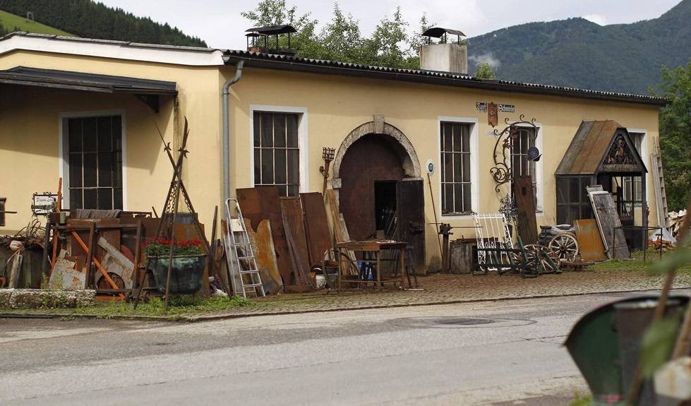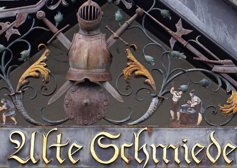 Вывеска «Старая кузница» на кузнице братьев Иоганна и Георга Шмидбергер в Мольне,