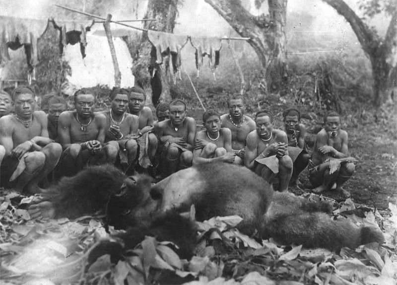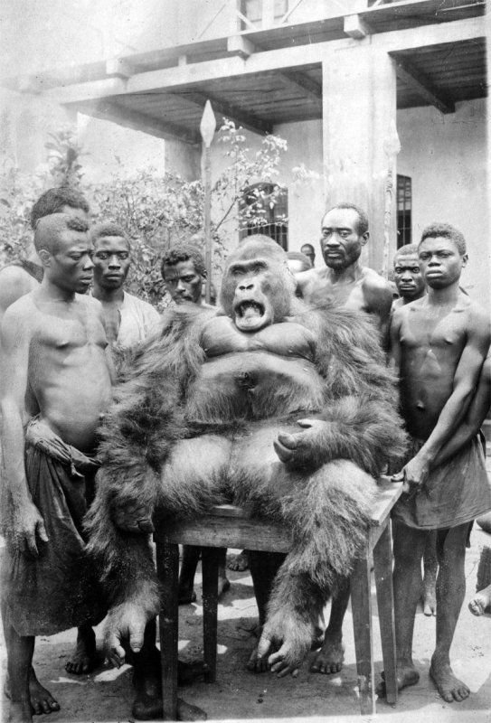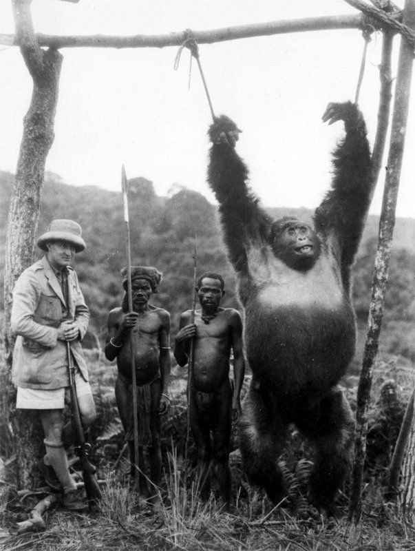 Сейчас гориллы находятся под охраной международного сообщества, но еще полвека назад не было ничего зазорного в том, чтобы застрелить примата на охоте вместе с местными аборигенами, а потом сделать из него чучело. Эти фотографии были сделаны в Конго в середине прошлого века.