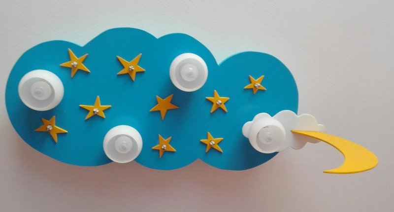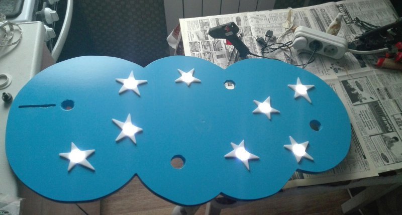 Вместо светодиодов купил такие лампочки с патрончиками, просверлил в звездах отверстия для них. Потом покрасил звезды и месяц