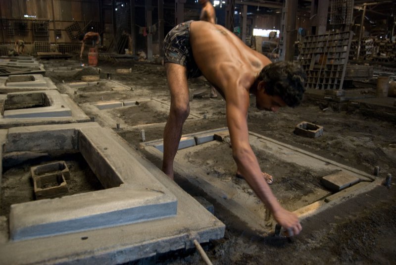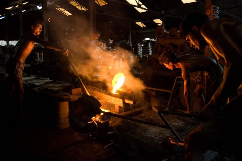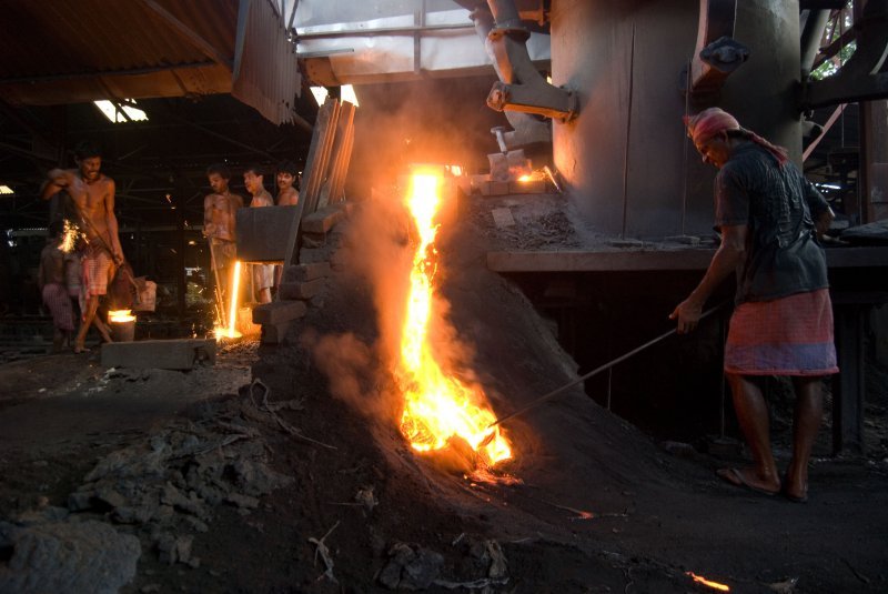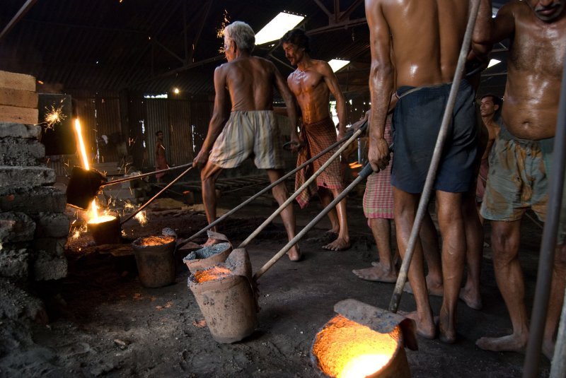 Все проще простого! Смущает только отсутствие каких-либо норм безопасности - все сталелитейщики работают практически в набедренных повязках, босиком, и ничто их не защищает от случайного попадания жидкого металла на кожу. Если же загорается край тряпки, покрывающей тело, то работник просто тушит огонь рукой и продолжает свою работу.