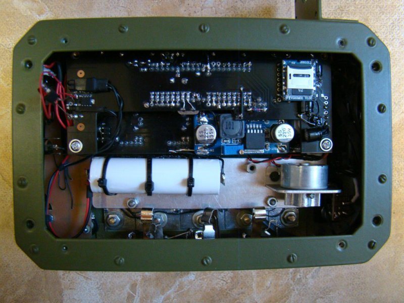 Также в схему добавлен DCDC на 5 вольт, поскольку LED-матрицы сделаны на спаренных светодиодах и при снижении напряжения на аккумуляторе ниже 3,8 вольт они резко теряют в яркости. На боковой стенке - динамик от ноутбука.