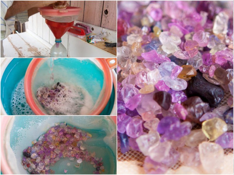 Добытые камни, промывают в воде. Затем промывают в хим.растворе, сушат и складируют.