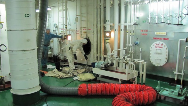Горловина вскрыта. Проверка атмосферы газоанализатором. И у каждого ещё личный газоанализатор. При падении кислорода менее 21% он заверещит и надо делать свал.