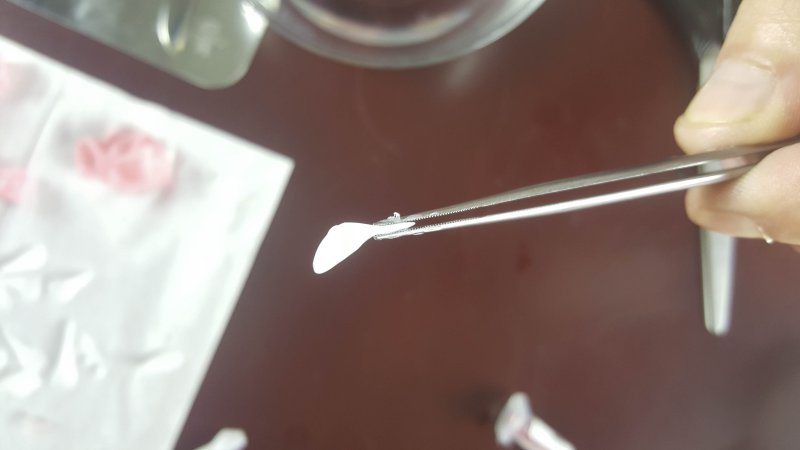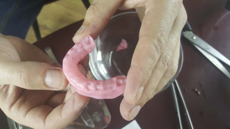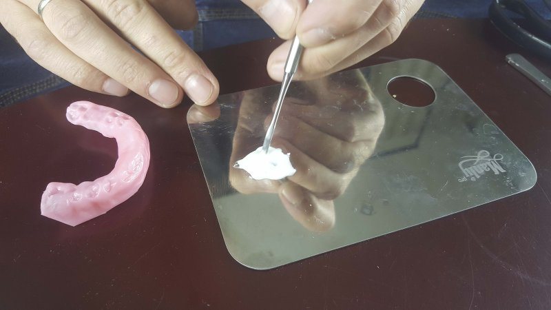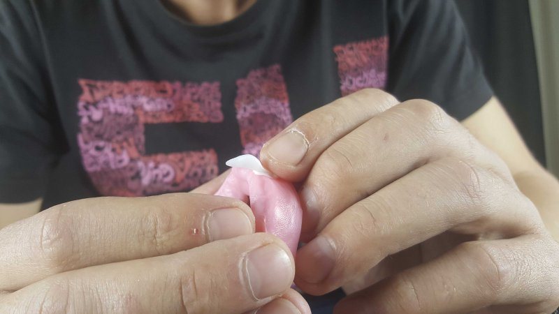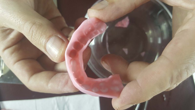 Далее формируем полоску из этого пластика в длину около 5 см, в ширину 0,5см, высоту 1 см и плотно прижимаем к челюсти