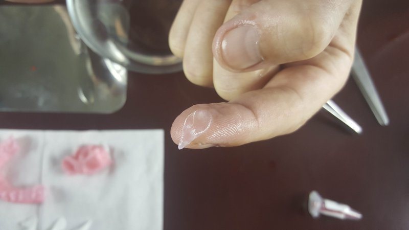 И тонким слоем(ни как у меня на фотке, начинаем приклеивать зубы, этот клей довольно шустрый и быстро стынет по этому клеить нужно в темпе