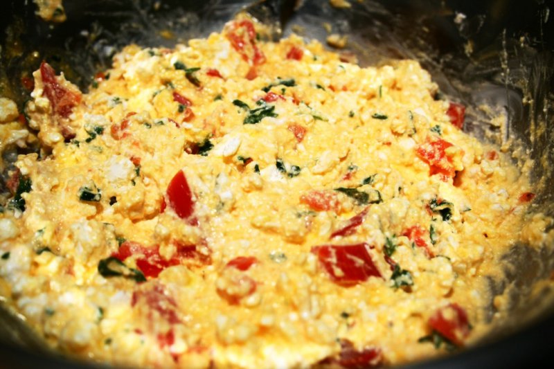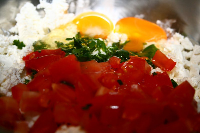 В разбитую брынзу добавляем яйцо, зелень, по желанию - мелко нарезанный помидор.
