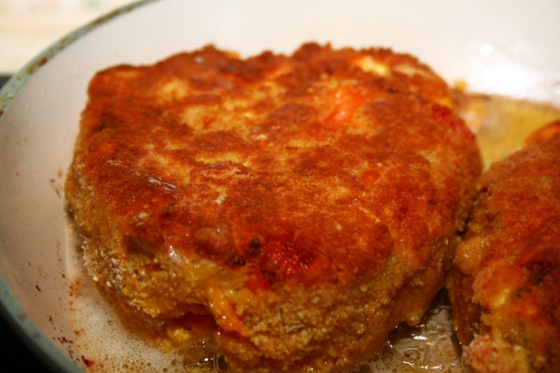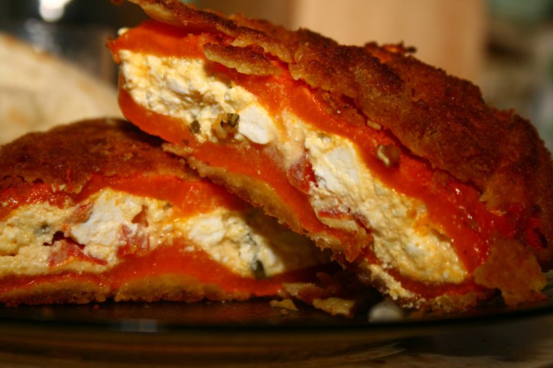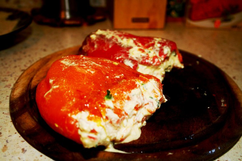 Фаршируем перец начинкой и пропускаем (обваливаем) его через муку, взбитые яйца и панировку. Процедуру можно повторить