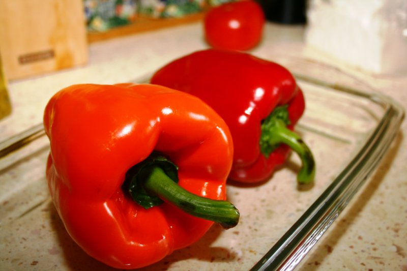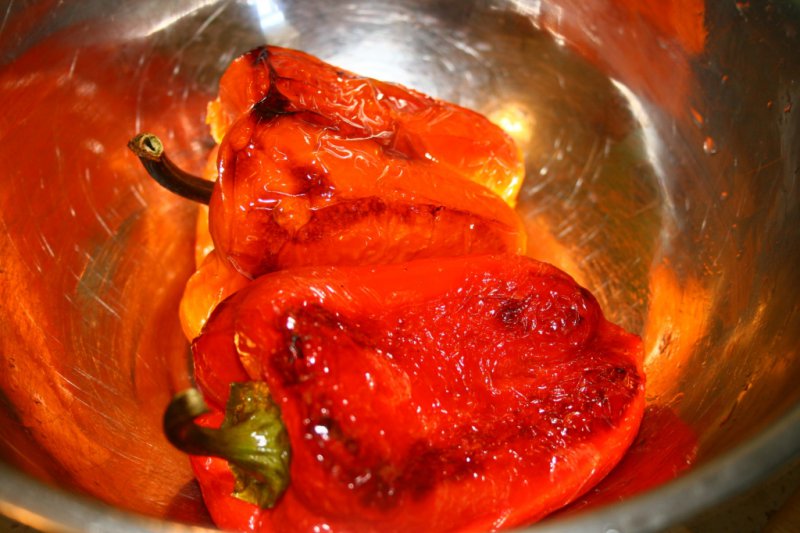 Исходные продукты - болгарский перец, брынза, яйцо, зелень, панировочные сухари. Перцы запекаем в духовке или жарим на сухой сковороде, после чего укладываем в посуду и накрываем крышкой. Оставляем минут на 15, чтобы кожица легче отошла.