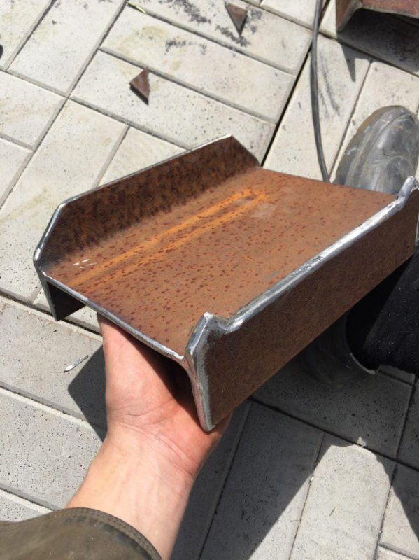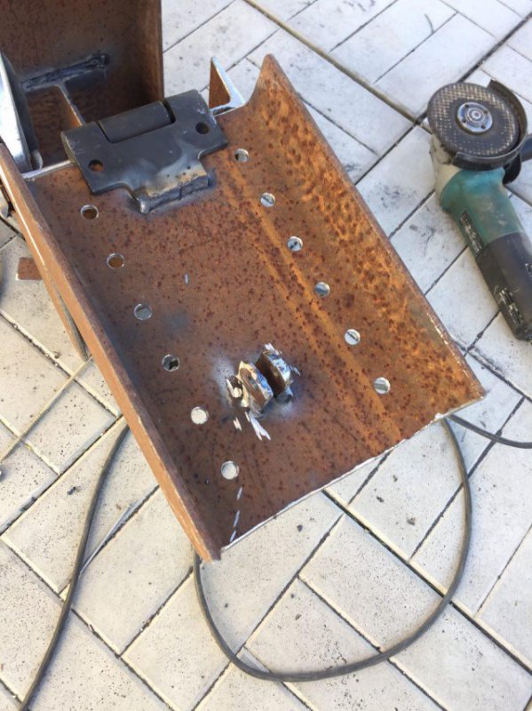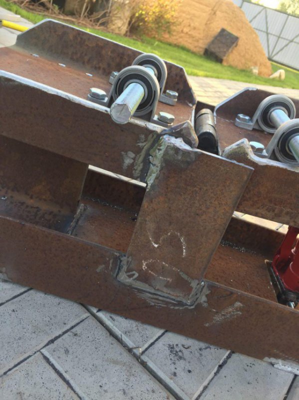 Переворачиваем конструкцию и делаем ответные петли для домкрата внизу под платформой и на основании (где мы уже вынули внутреннюю часть двутавра, будет видно дальше)