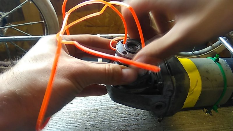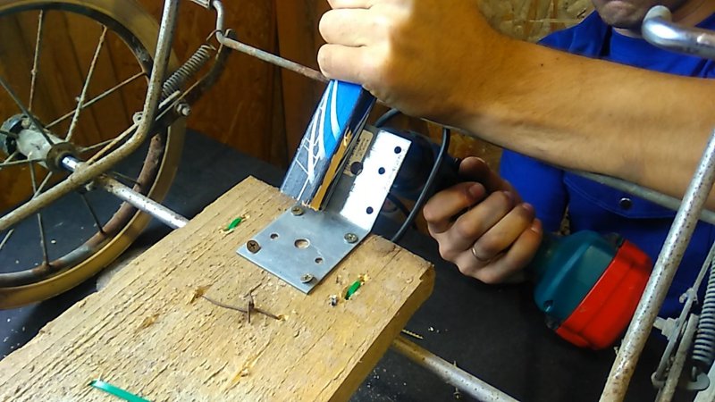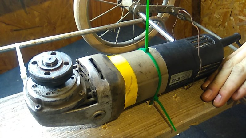 Потом расположил болгарку, зафиксировал кнопку включения изолентой, и закрепил саму болгарку