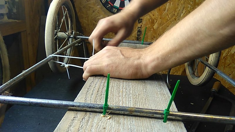 Затем отрезал нужный кусок доски, просверлил в ней отверстия и закрепил пластиковыми стяжками