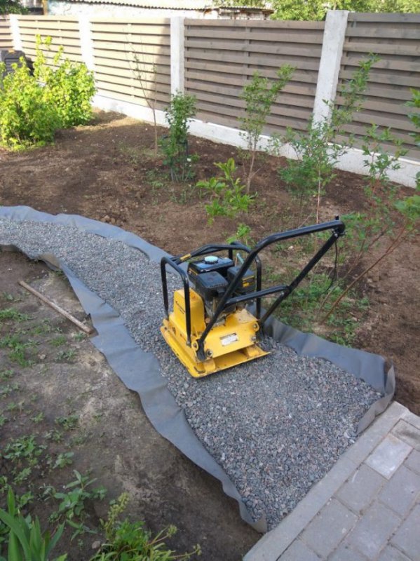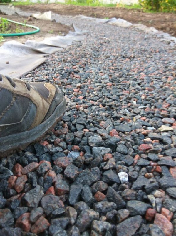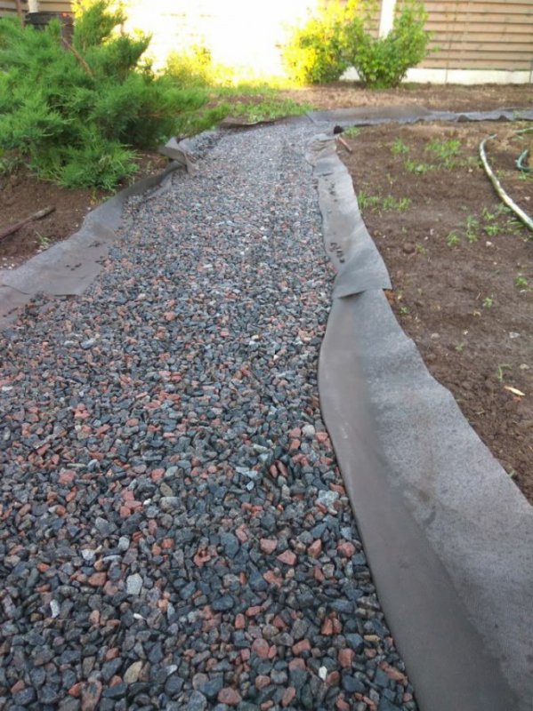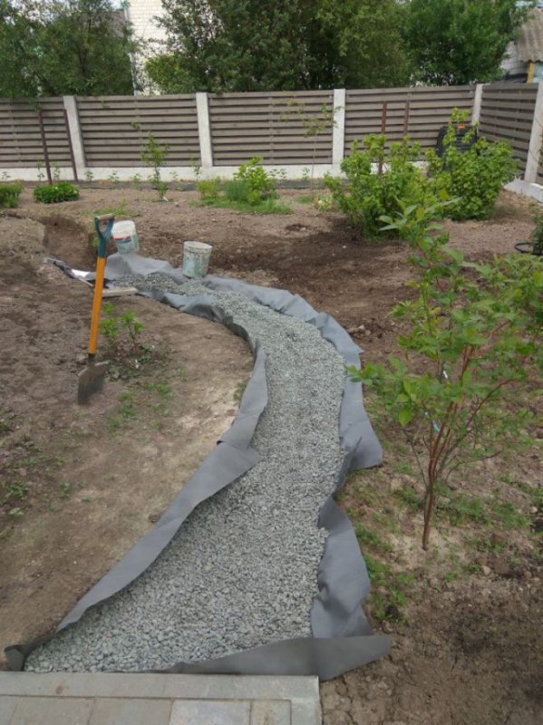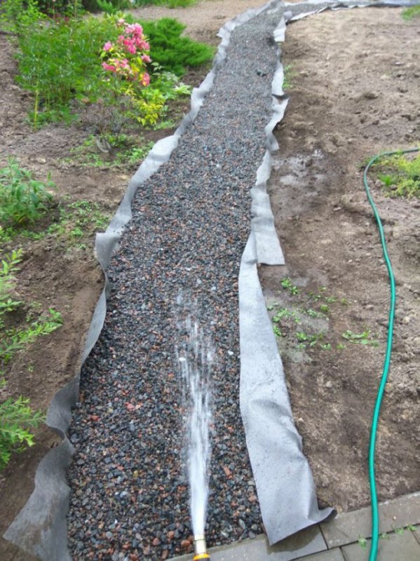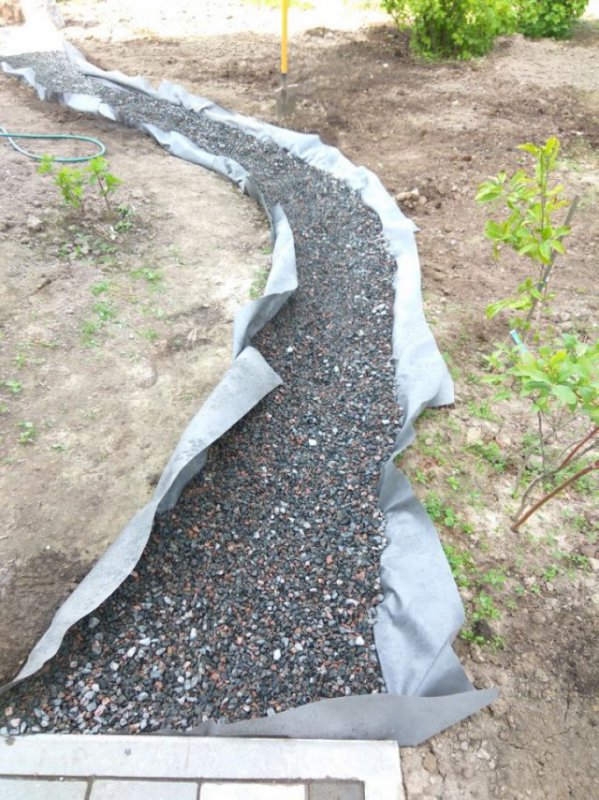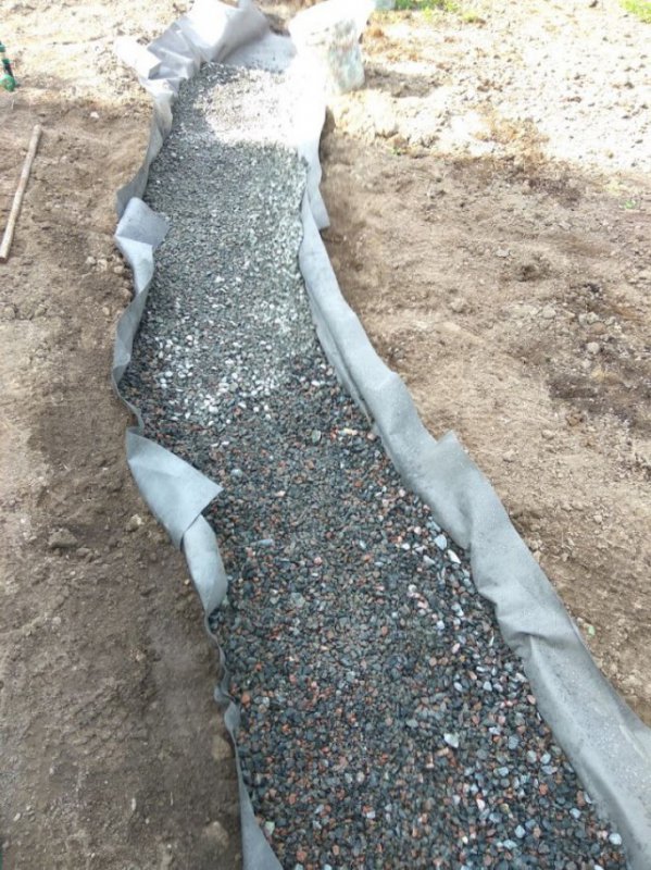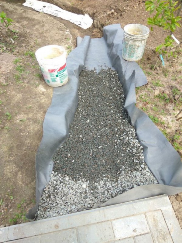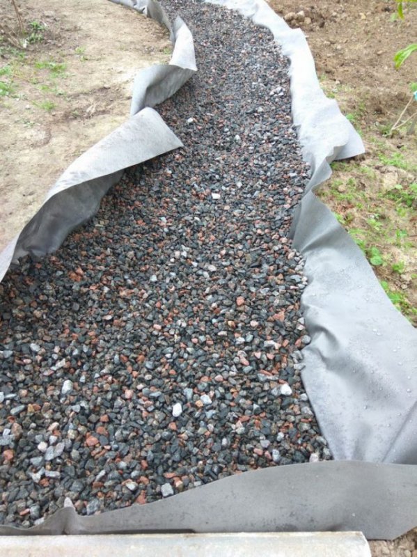 Покупаем плотный геотекстиль и укладываем в вырытую траншею. Он не даст уплыть в землю нашему щебню. И начинаем таскать и засыпать щебень