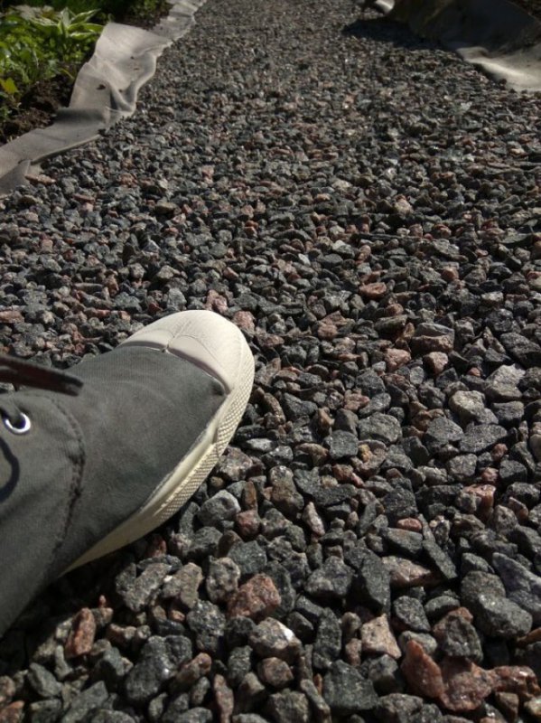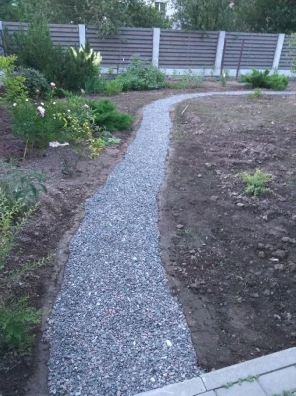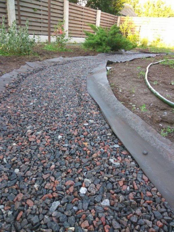 После грязного строительного бедствия участок понемногу очистился от мусора, понатыкался всякими кустами да цветами и решил я газон устроить. А где газон там и дорожка. В силу того что лень родилась раньше меня, мне очень не хотелось делать сложно и долго. Так и родилось вот это. Может быть оно и слегка корявое, но детище моё и я его люблю