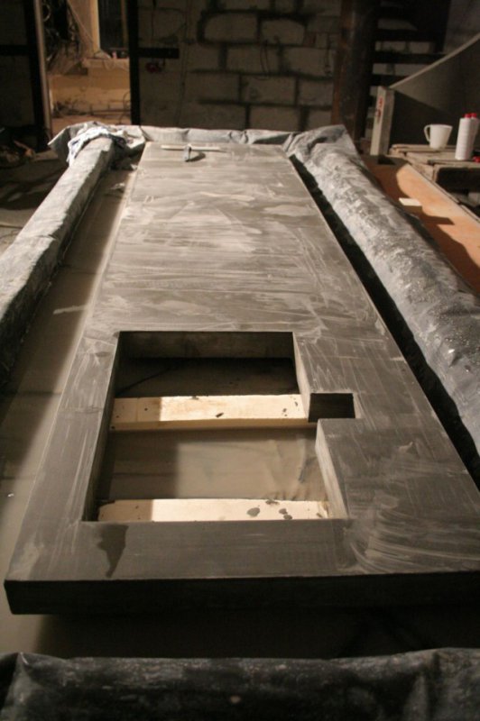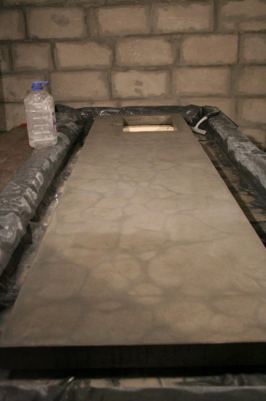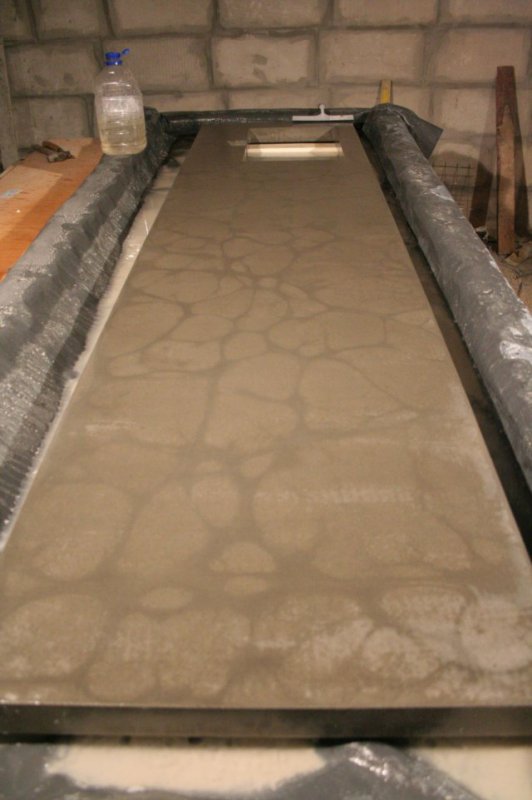 Замешал пескобетон с пластификатором. Залил в форму. Отвибрировал. Затер. Первую неделю обильно проливал. На вторую неделю снял опалубку. Вот такая вот отливка получилась. Сразу оговорю, что стремления получить идельно отлитую столешницу не получилось. Но шлифовка помогает.