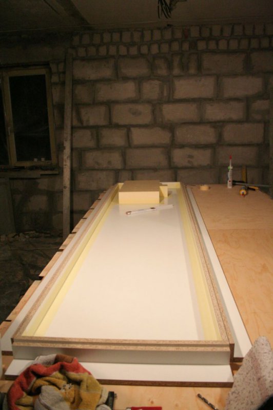 Под раковину вырезал из пенополистерола форму. Отшлифовал ее. Приклеил на место