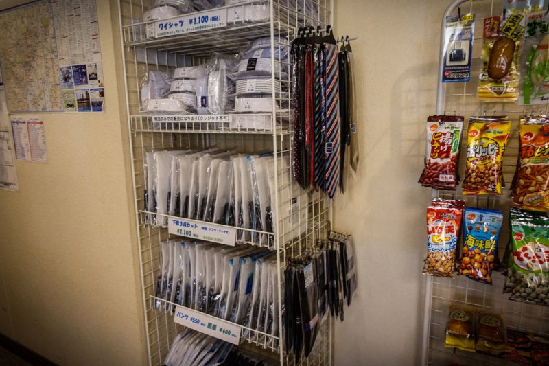 Рядом продаётся всё, что может понадобиться работнику офиса, который не ночевал дома: галстуки, белые рубашки, чёрные носки. Не будет же сэлэримэн носить одно и то же два дня подряд!