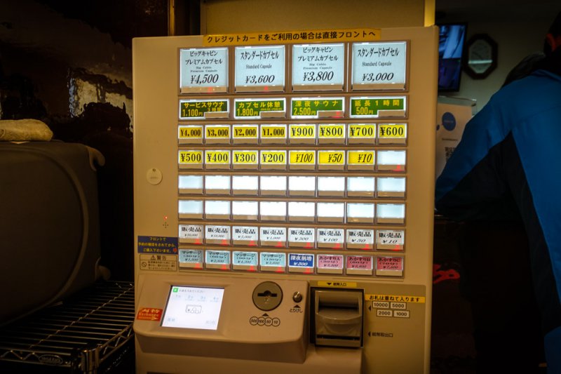 Очевидно, сотрудникам ресепшена не доверяют с наличкой, так что оплата производится вот в такой машинке. Сегодняшняя капсула стоит 2,500 иен, то есть около $23. Интересно, что такой кнопки на автомате нет, приходится оплачивать отдельно 2,000 и 500.