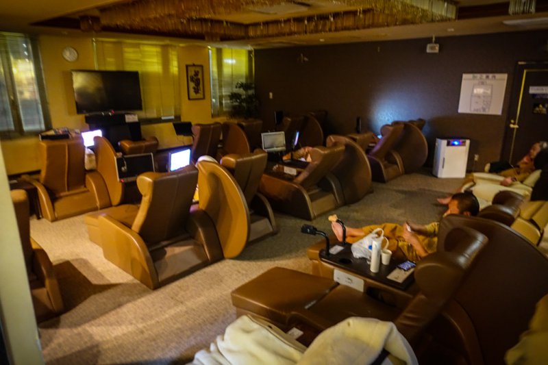 Если после парилки вам ещё неохота спать, то есть этаж с салоном. Тут можно устроиться поудобней, посмотреть телевизор, и даже покурить. С курением у японцев всё не как у людей. Они его запретили на улице, и разрешили в помещениях!