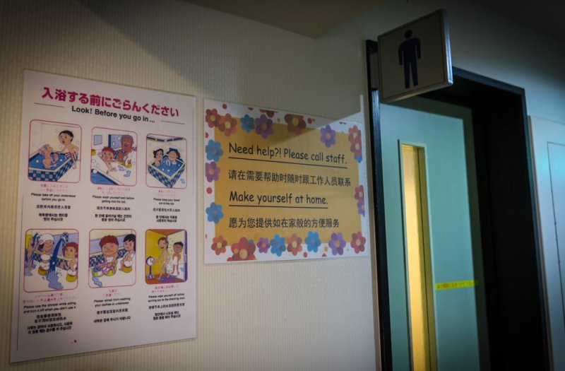 Но если вам нужен душ, то для этого пройдём в онсен. Перед входом инструкция к употреблению для японцев и гайдзинов. Рассказывают как правильно сидеть в онсене.